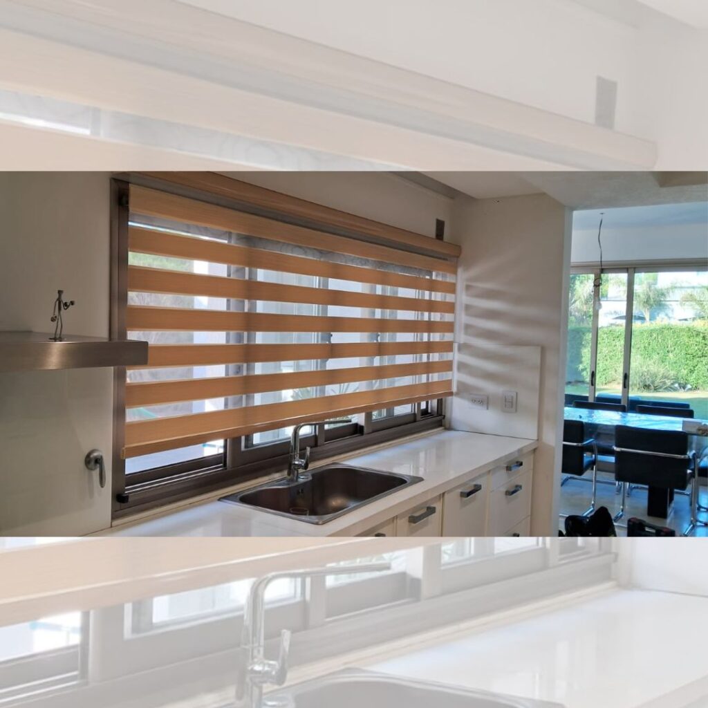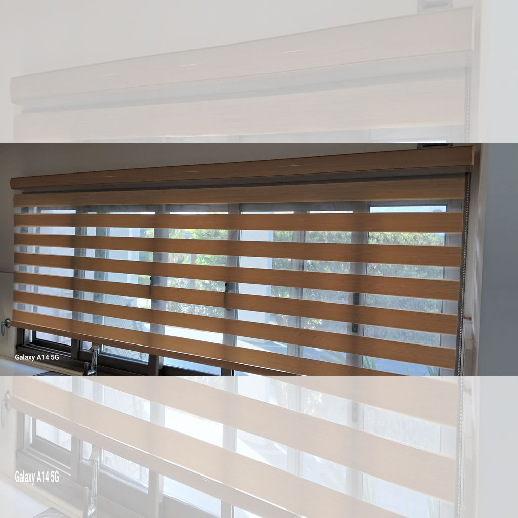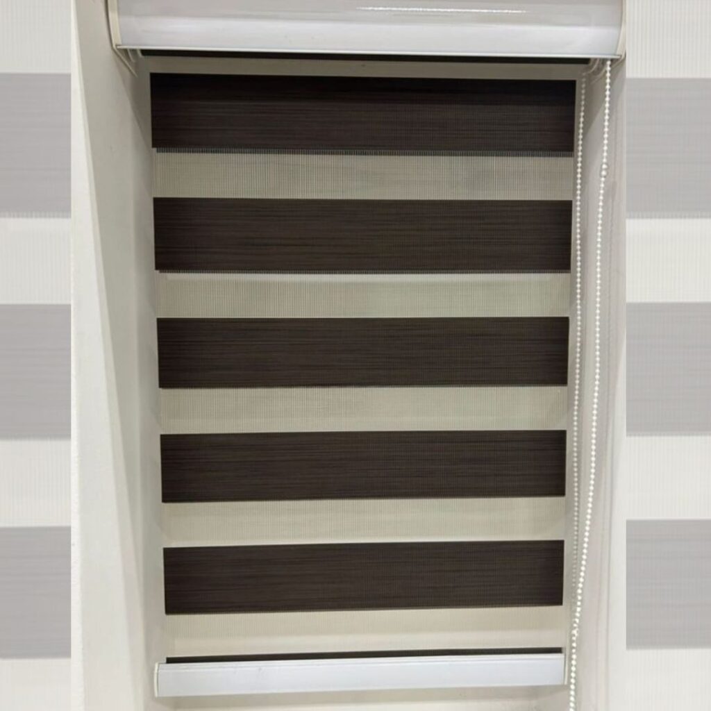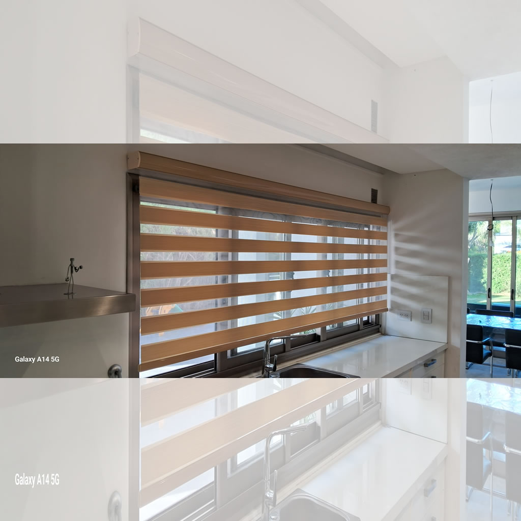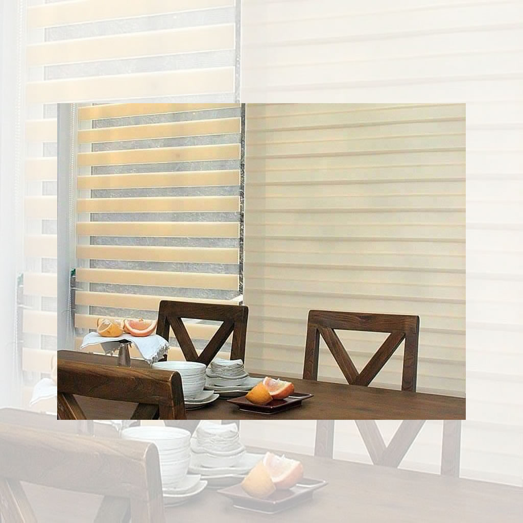 Cortinas Roller Zebra son un sistema doble de bandas horizontales fabricado con maquinaria de alta tecnología y los mejores materiales del mercado. Este tipo de sistema permite que al estar enrollado (posición cerrada) el ambiente tenga total privacidad sin perder iluminación y que al estar desenrollado (posición abierta) se pueda tener una visión clara hacia el exterior a través de las bandas horizontales.